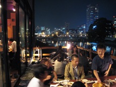 川床で対岸沿いのライトアップを見ながら、またお酒を
