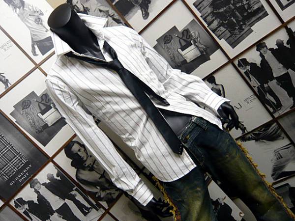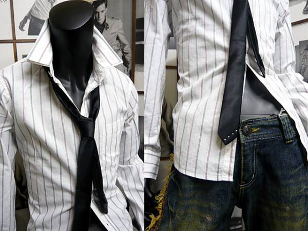 襟が2枚重ねになったストライプシャツとライトストーン付ネクタイのセット。